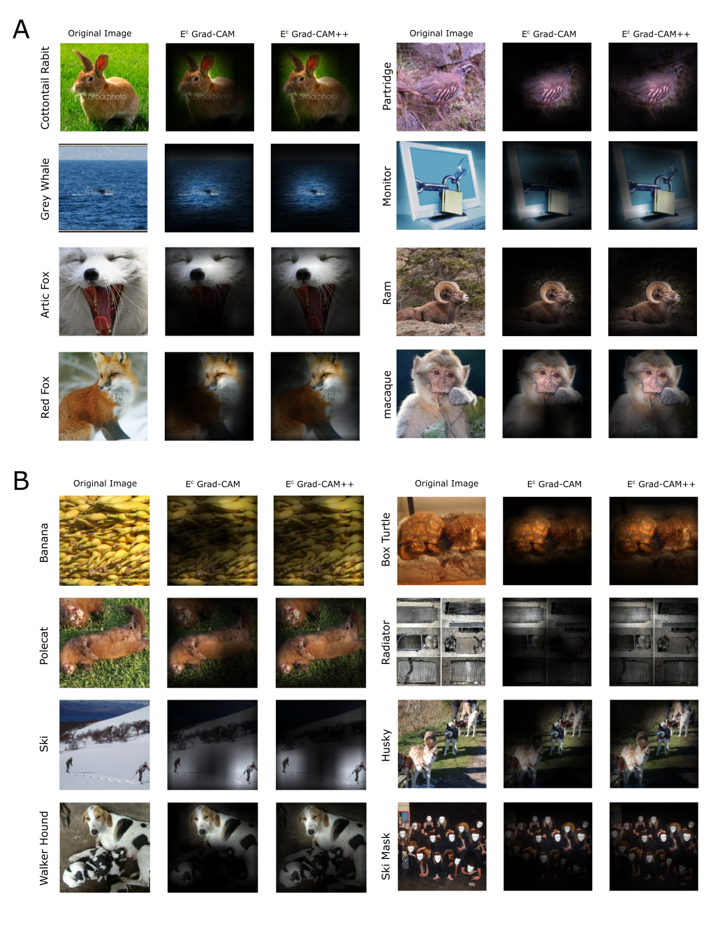 Explanation maps Ec for images generated by Grad-CAM and Grad-CAM++. These explanations are for the AlexNet architecture.